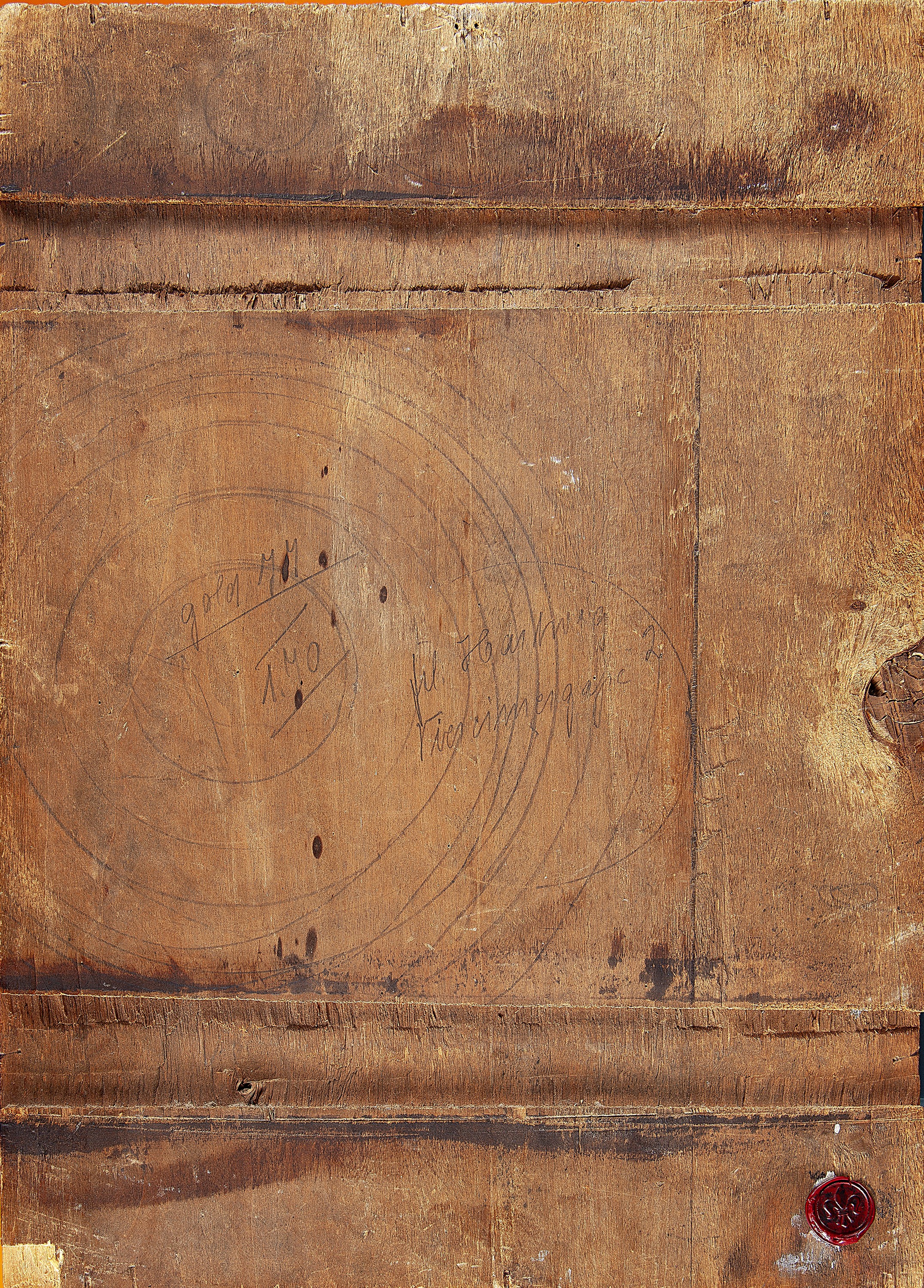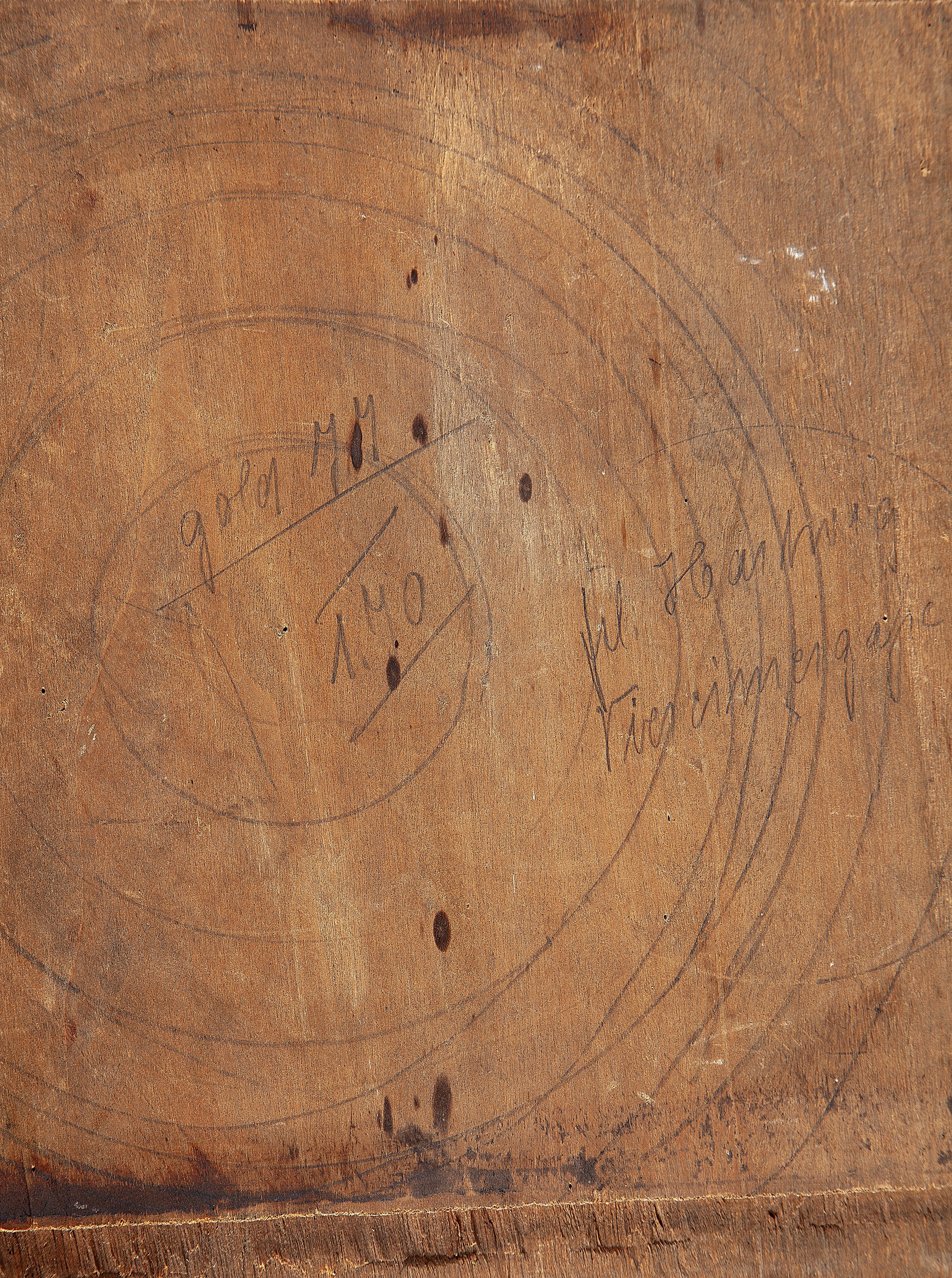 Small concentric circles with hand-drawn numerical markings suggest that the panel underwent meticulous compositional calculations before being painted. This is a typical procedure for artists associated with philosophical-artistic schools that integrated mathematics into visual aesthetics.