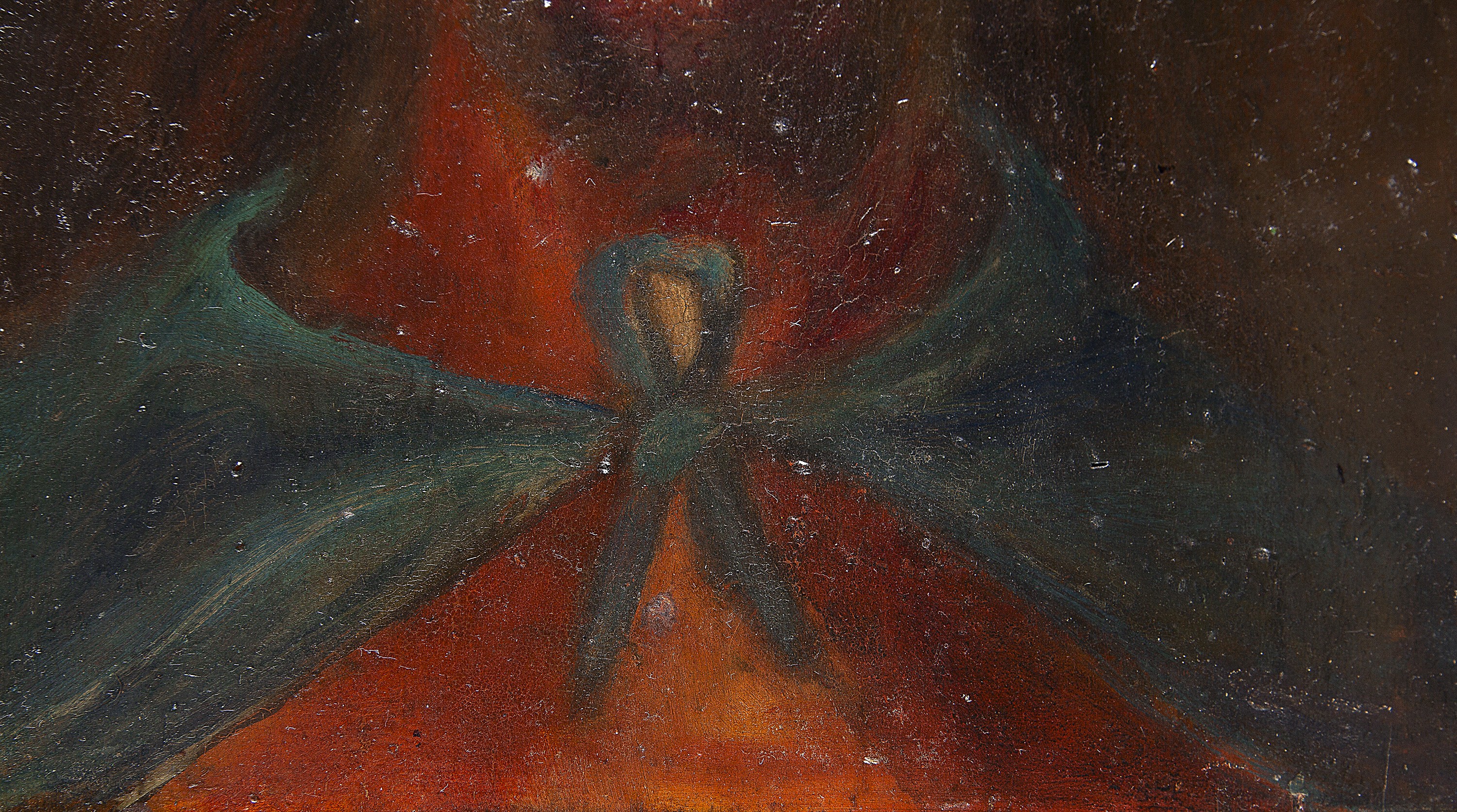 An oil painting on European poplar wood (Populus alba), measuring 44.4 × 32 cm, discovered outside the official circuits of art history. With no visible signature, no documented provenance—just a face, a light, and silence.