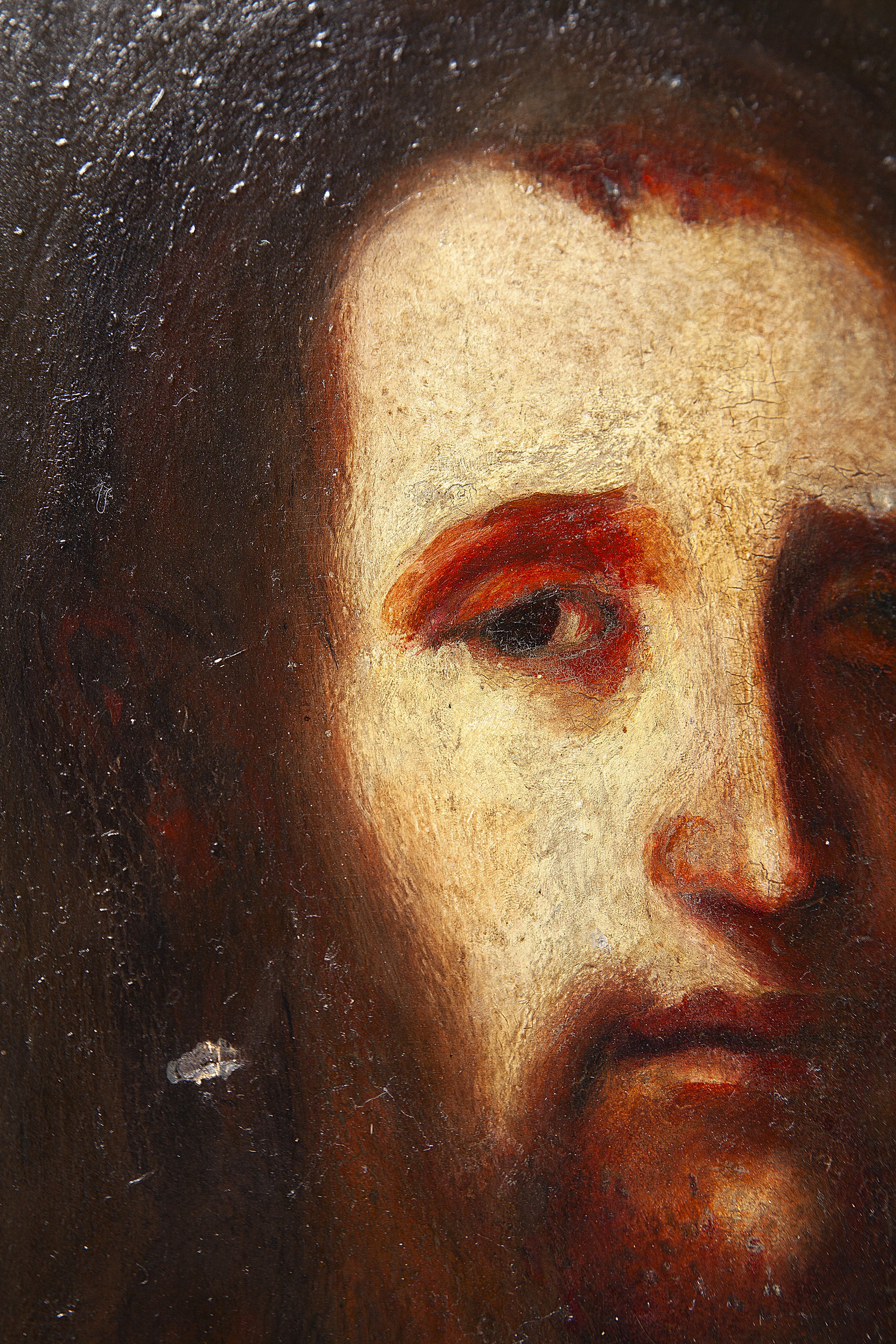 The meticulous examination of the reverse of the work reveals one of the most decisive aspects for its technical, historical, and symbolic evaluation. Unlike modern paintings, where the reverse tends to be flat and industrially treated, this panel presents unequivocal signs of artisanal antiquity. The wood used is solid, thick, and darkened by the action of time. With approximate dimensions of 44.4 cm high by 32 cm wide, the structure is perfectly within the standards of portraits produced between the 15th and 16th centuries.