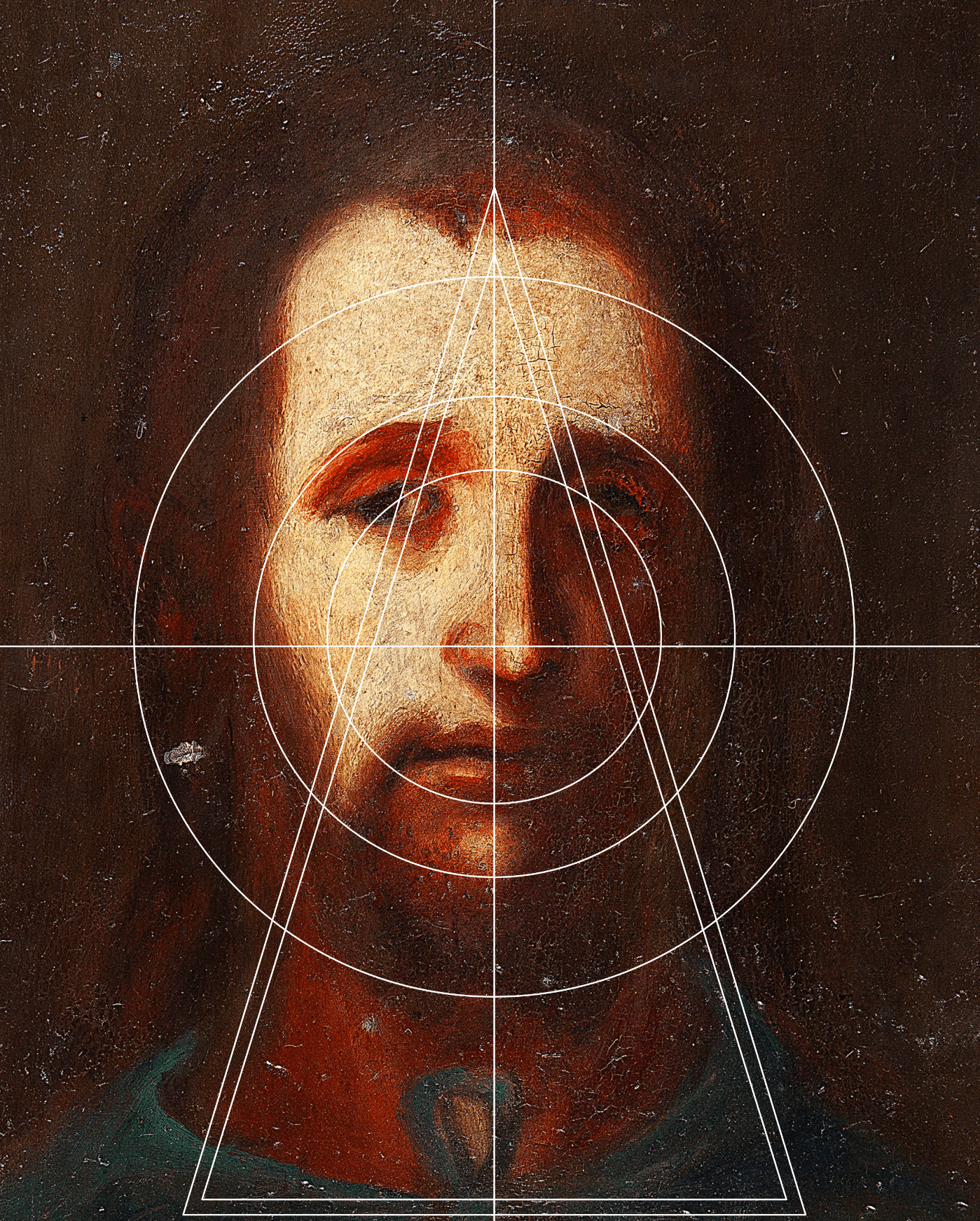 This painting displays an overlay of geometric forms —concentric circles, an isosceles triangle, and axial lines —centered around the figure’s face. These constructions are deliberate and reflect the use of sacred geometry, a technique applied by Renaissance masters such as Leonardo da Vinci. The circles map ideal facial proportions, reinforcing symmetry and balance. The triangle, positioned from the top of the head to the shoulders, evokes stability, spiritual ascent, and divine harmony.