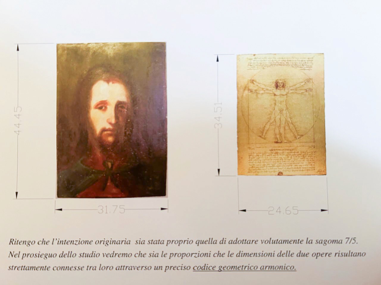 The golden circle of the Vitruvian head rests precisely on the luminous center of the figures forehead, like a solar crown. The open arms touch the horizontal limits of the frame. The Vitruvian hands and feet coincide with the paintings boundaries, while the mirrored yellow script from the manuscript appears as if it were the sacred prologue of the image. This alignment cannot be replicated with other artworks or other proportions. It occurs only with this specific painting, at this scale, in this position, and with this degree of fidelity. This nullifies the hypothesis of chance and supports the thesis of intention and consequently, of authorship.
