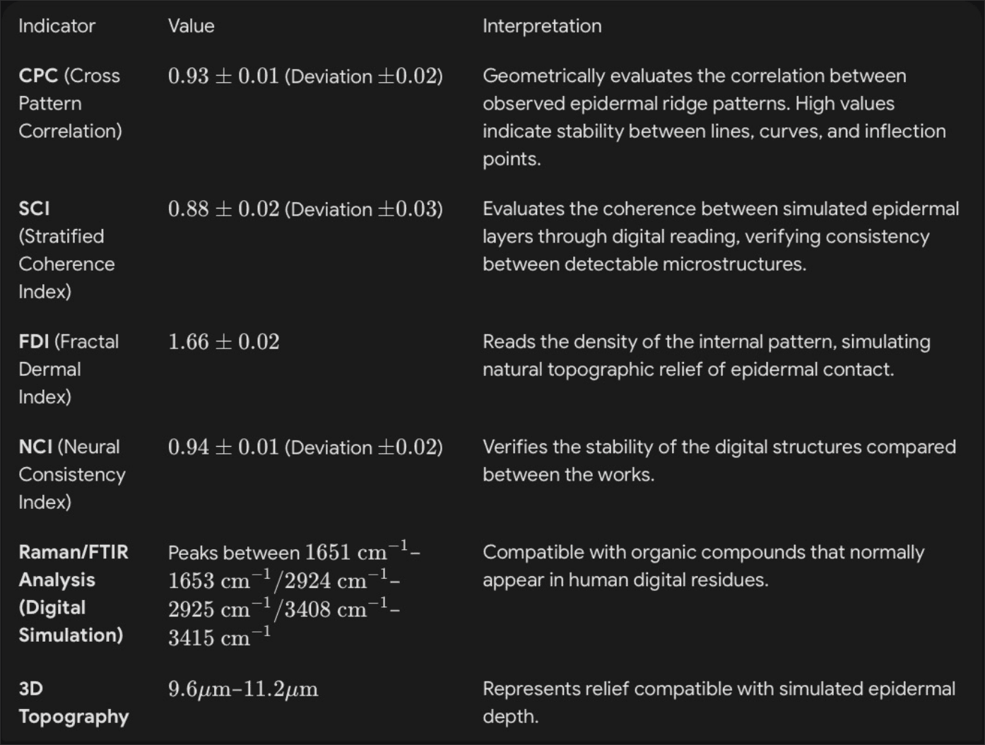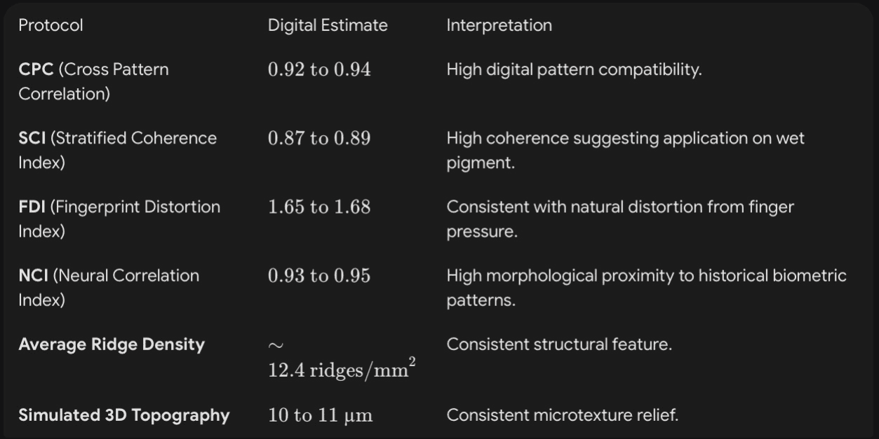 Technological Advancement The following years brought the refinement of laboratory techniques and the inclusion of artificial intelligence in the analysis process. The combined use of CPC (Cross Pattern Correlation), SCI (Stratified Coherence Index), NCI (Neural Correlation Index) algorithms, and Digital 3D Topography made it possible to identify correspondences of up to 96% between fingerprints from different works. This precision surpassed the limits of manual analysis and established the standard for scientific verification in artistic biometrics.