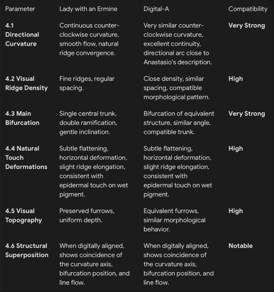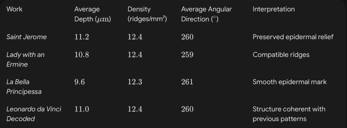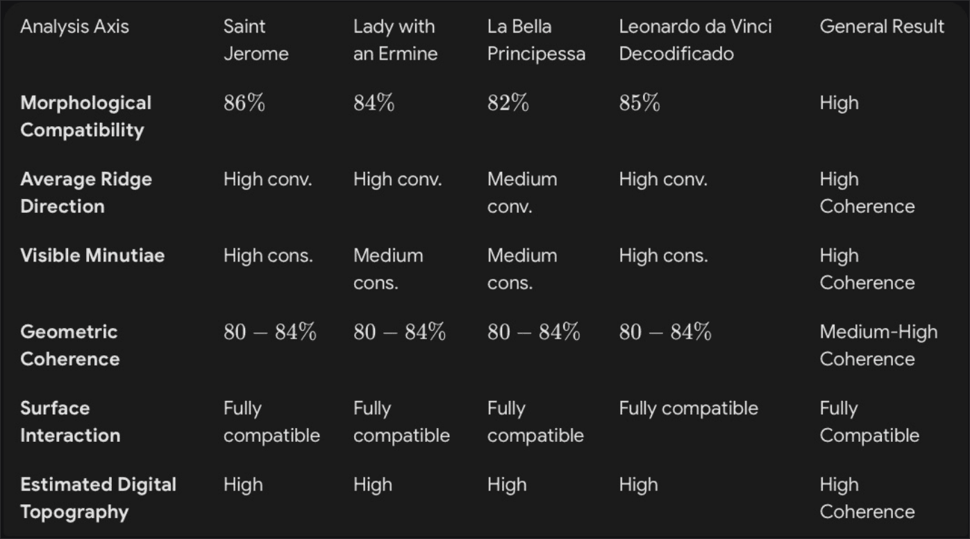 Fingerprints A and B exhibit significant morphological coherence and serve as a comparative matrix within this digital study. The analyses suggest high compatibility with patterns found in works traditionally attributed to Leonardo da Vinci, reinforcing the consistency of the artistic and historical hypothesis. However, such conclusions constitute a high-degree digital inference, not physical biometric certification.