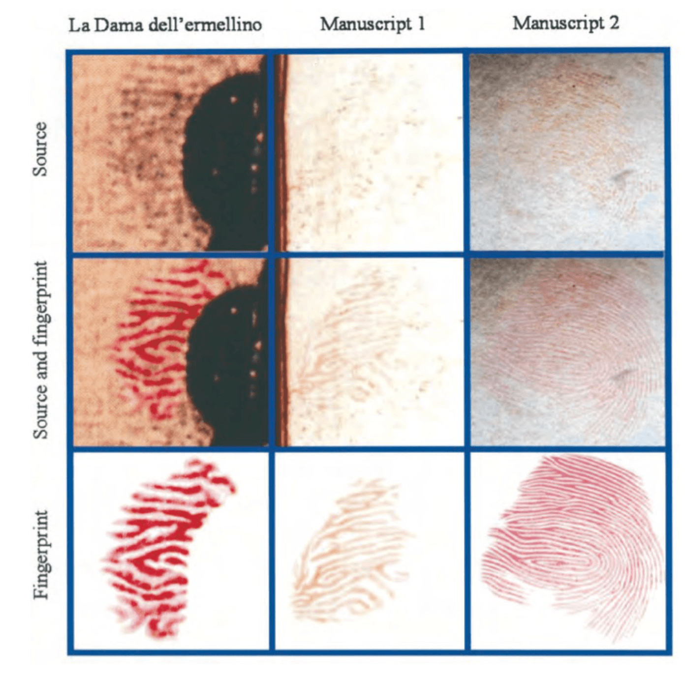 The morphology of the left thumbprint is consistent in the La Dama dell'ermellino necklace shadows and in all the papers examined (Manuscript No. 1: see figure 2a; Manuscript No. 2: see figure 2b), and has been reconstructed by computer, merging numerous partial prints