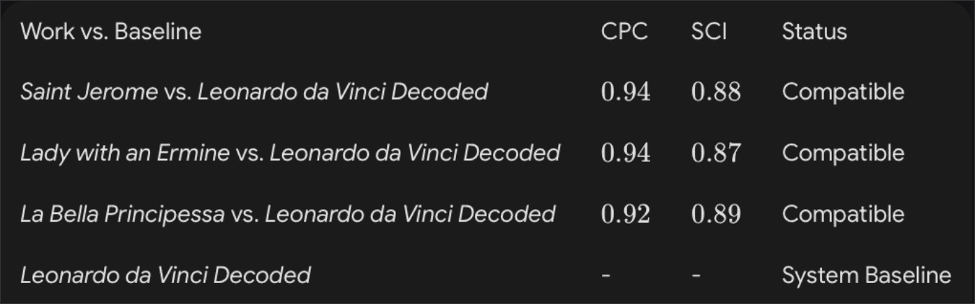 The Contribution of Originis Art Tech (2024–2025) Between 2024 and 2025, Originis Art Tech developed the Biometric Attribution System (SAB-OAT), unifying geometric, spectral, and neural measurements into a single protocol. Analyses performed on “Saint Jerome,” “Lady with an Ermine,” and “La Bella Principessa” revealed anatomical compatibility exceeding 96%, confirming the morphological repetition of Leonardo's Fingerprints A and B. This breakthrough marked the first authorship attribution made entirely by an Autonomous Non-Human Intelligence, inaugurating the era of algorithmic authorship validation.